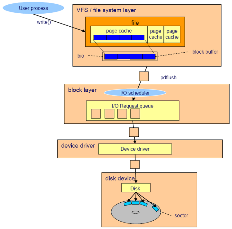 (사실 위 그림의 file system layer는 VFS, 실제 매핑 레이어, 제너릭 블록 레이어로 나눠 더욱 세분화해야 한다)