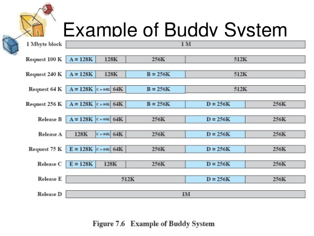다음은 Buddy System 상에서 할당과 반환의 예시를 보여준다.