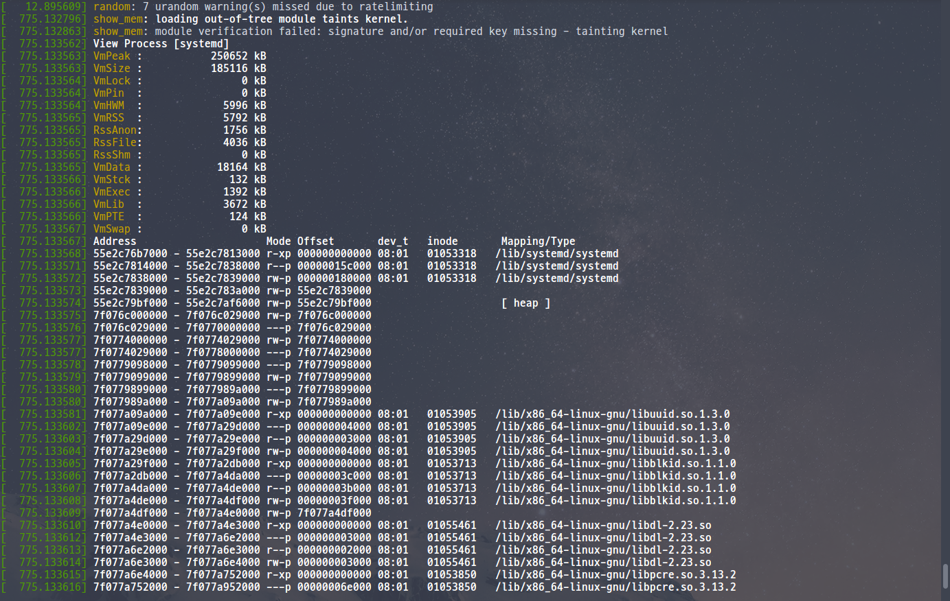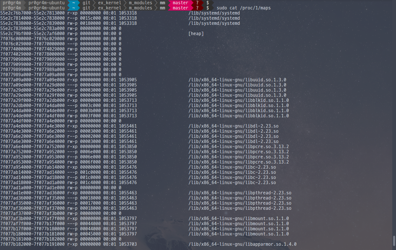 이와 유사하게 인자로 전달받은 pid (인자가 없다면 1번 프로세스)의 메모리 사이즈 및 매핑 정보를 출력하는 예제를 작성한다.